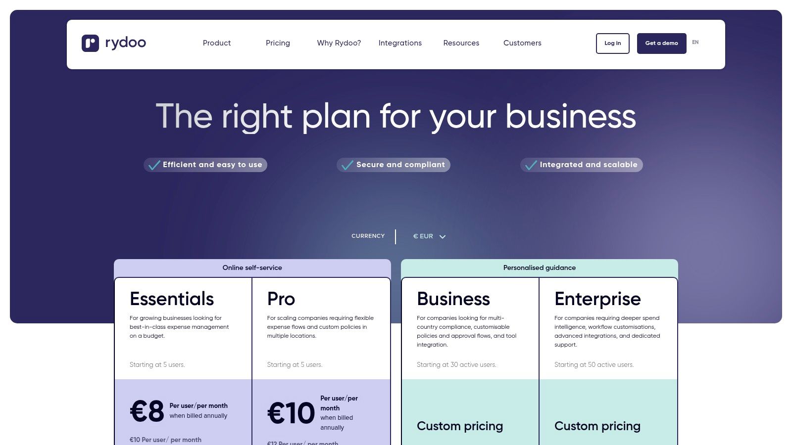 Rydoo’s pricing is transparent, typically based on a per-user, per-month model, though minimum user counts often apply. It scales from essential expense tracking to advanced enterprise solutions with optional add-ons like smart cards.