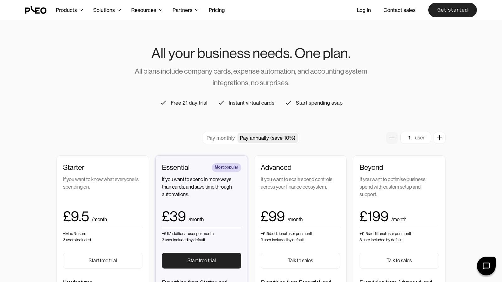 Pleo offers a tiered pricing model that scales with your team's needs, starting with a free plan for small teams just getting started. Paid plans add more advanced features like credit options, cashback, and deeper integrations with accounting software like Xero and QuickBooks.
