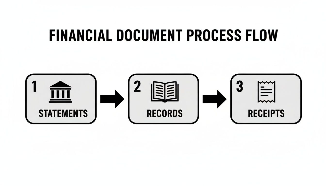 | Document Type | What to Look For | Where to Find It | | --- | --- | --- | | Bank Statements | The full statement for the period you're reconciling (e.g., last month). | Your online banking portal (usually as a PDF or CSV download). | | Your Accounts | Your own record of income and outgoings. | Your accounting software (like FreeAgent) or a detailed spreadsheet. | | Receipts & Invoices | All the proof for your spending and sales. | Email inbox, photos on your phone, physical wallet, supplier dashboards. |
